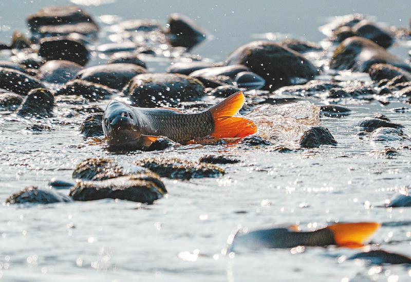 2022年4月11日 泸州市长江滨江路浅水区,成群鲤鱼跃出水面产卵,围观市民惊叹,“多年未见此景了”。