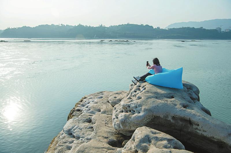 2020年11月14日 泸州市民在长江边晒太阳,并用手机拍摄江景。