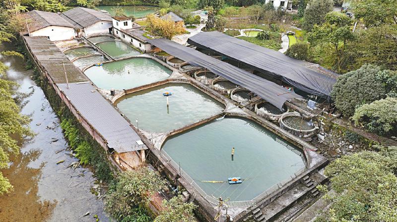 暮色轻合,周亮拎起一个装满饲料的塑料桶,招呼他的“宝贝孩子们”来开饭。不远处,专门设计的管道,把地底涌出的山泉水持续送入池中,汩汩地激起清冽的水花。