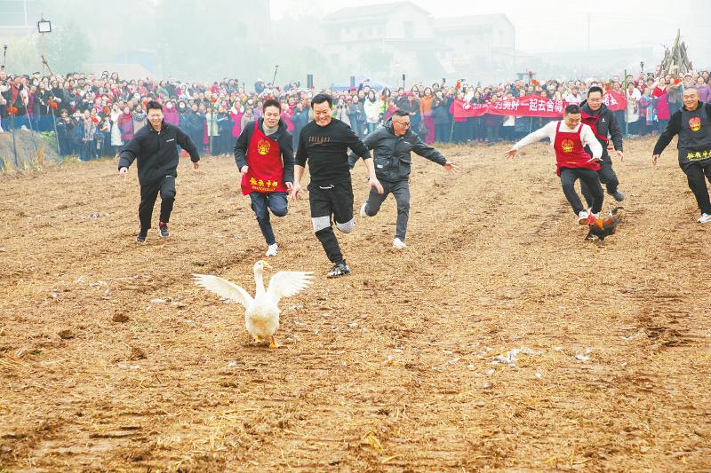 上午9点过,来自四面八方的客人陆续抵达,共同品尝热气腾腾的美食。现场除了传统的“刨猪宴”,还安排了捉猪、捉鸡鸭鹅、趣味套圈、吃柠檬比赛等互动体验项目及歌舞表演。