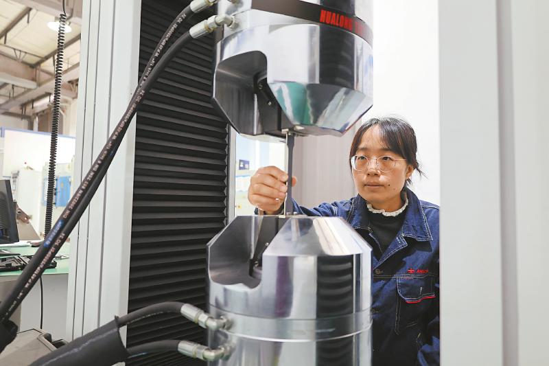 “砰!”随着一声脆响,一个2200兆帕级钢样拉伸断裂。“最高强度达2186兆帕,应变最大值为7.5%……”实验室内,工程师尹晶晶记录着汽车钢强度与塑韧性的实验数据。
