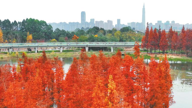 成都白鹭湾湿地公园里,自由生长的水杉林与远方的城市景观融为一体。四川日报全媒体记者 韦维 摄