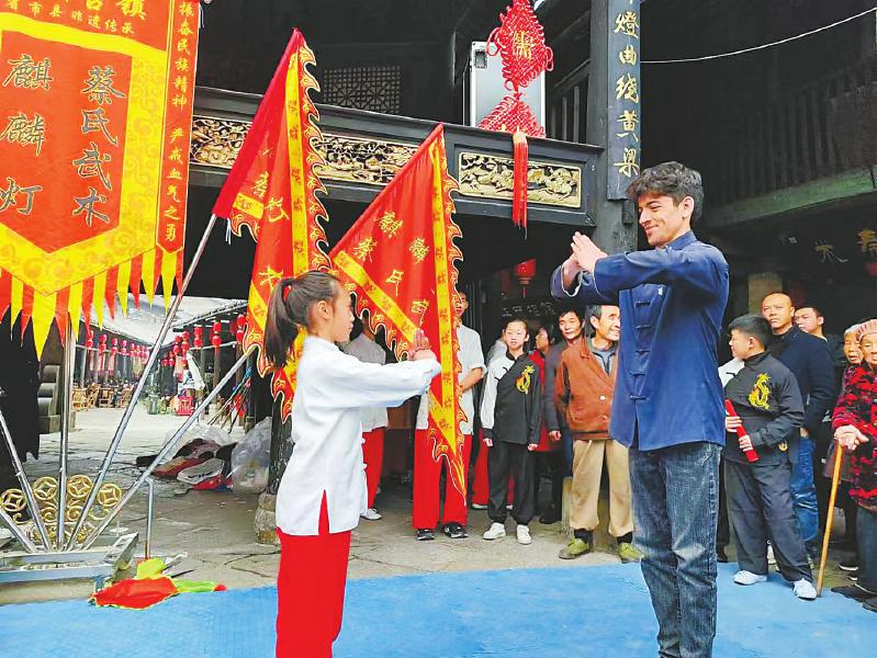 罗城古镇戏楼外外国游客体验赵门蔡氏武术。 受访者供图