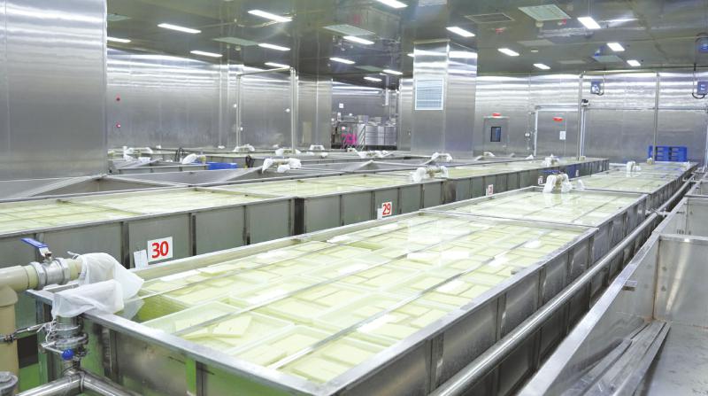 去年6月,“六月天”投资3500万元的三期改扩建项目投产,新生产线每天可生产125万块包浆豆腐,可实现从黄豆浸泡、磨浆、点浆到成型、切块、包装的全流程自动化。“点浆由数据精准控制,切块工序所需人力从12人减至2人,整条生产线用工减少近半,产能与标准化水平大幅提升。”蒲小芳表示,计划将数字化转型进一步延伸,未来公司有望实现从“一颗黄豆到一块豆腐”的全流程溯源。