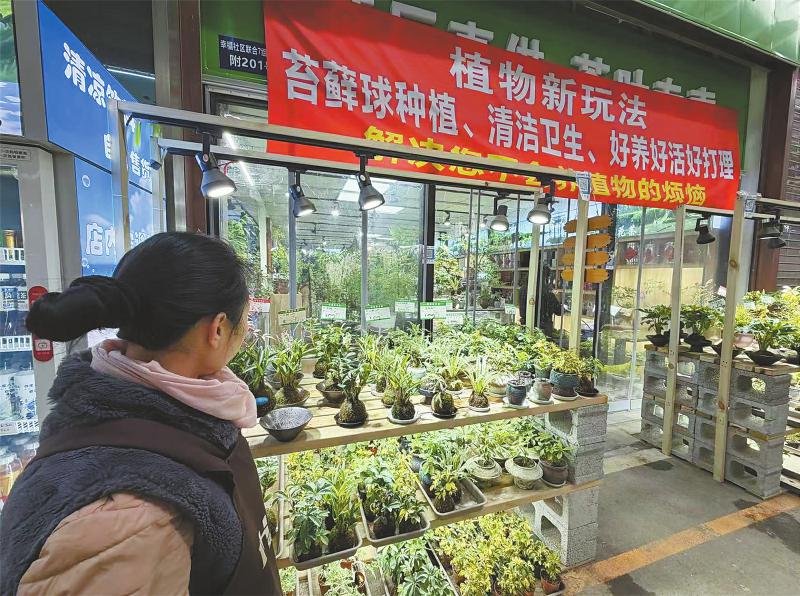 这个不用费心打理,要是干了,就把它扔进水里泡1分钟,再拿出来继续摆,十天半个月都不用管……”1月21日,成都市锦江区三圣花市某绿植店,花艺师郭刘丽托着一个绿茸茸的苔藓球,向顾客演示养护方法。不到5分钟,这笔生意便顺利成交。