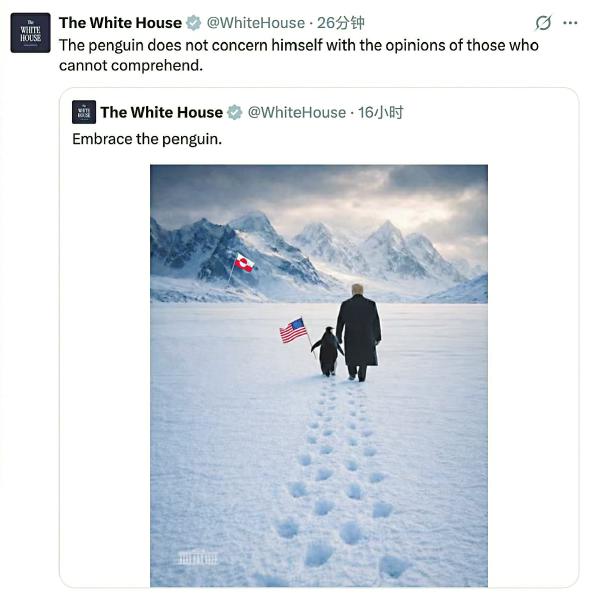 白宫当天稍晚再次转发这一图片,并配文“企鹅从不在意那些无法理解它的人的看法”,但依然无法阻止网友继续冷嘲热讽。