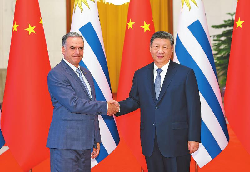 习近平指出,当今世界正处于百年未有之大变局,国际形势变乱交织,单边霸凌愈演愈烈,中方支持乌拉圭接任“77国集团和中国”轮值主席国,愿与乌方加强全球南方团结协作,共同推进平等有序的世界多极化、普惠包容的经济全球化,携手并进、共谋发展,为构建人类命运共同体作出更大贡献。中方始终重视中拉关系,支持拉美和加勒比国家维护自身主权、安全、发展利益,支持乌拉圭接任拉美和加勒比国家共同体以及南方共同市场轮值主席国,愿同乌方和地区国家推动共建中拉命运共同体走深走实。