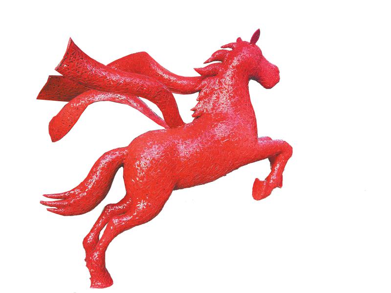 红色竹丝编织而成的巨型奔马装置。 受访者供图
