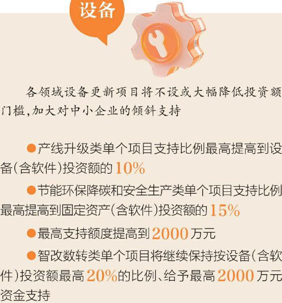 设备更新方面,今年新增支持民生、安全及消费基础设施领域8个方向设备更新项目;消费品以旧换新方面,聚焦汽车、家电、数码和智能产品,进一步集中有限补贴资金,重点支持覆盖人群广、带动效应强的消费品。同时,省级财政继续安排资金,对工业等重点领域设备更新与技术改造给予有力支持。