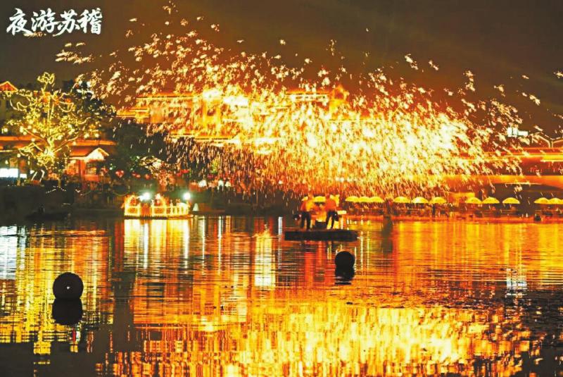 宝莲广场几公里外的苏稽古镇,“沉浸式”夜游巡演准时开启。非遗打铁花让金色火花在峨眉河上空绽放,龙舟随之“起舞”,搭配《峨眉山月》《最忆是苏稽》等歌曲演绎,构成了一场视听盛宴。