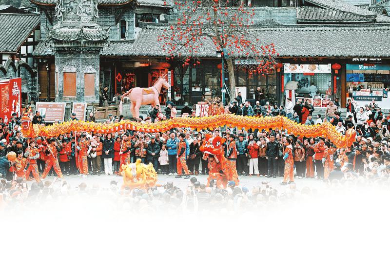 2月17日,成都崇州市街子古镇,一场精彩纷呈的龙狮表演在银杏广场火热上演。 周静 摄(C视觉)