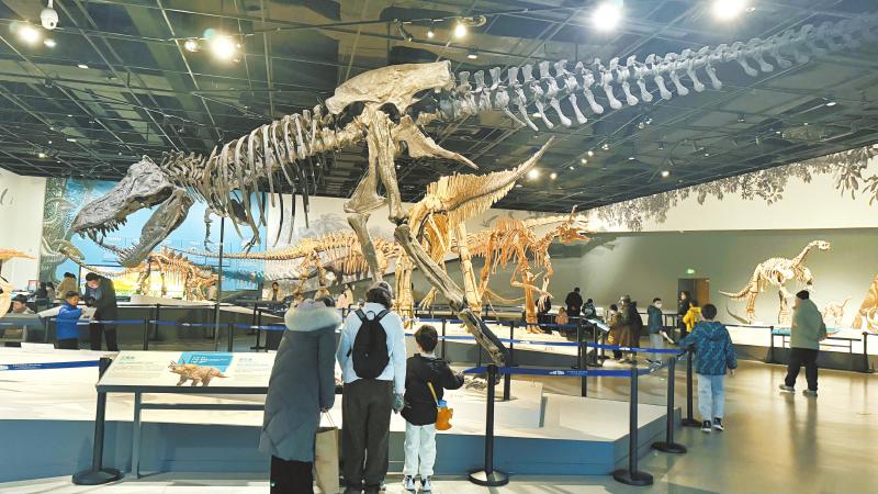 馆内的龙行川渝厅与恐龙揭秘厅,共同构成了一座微型“恐龙世界”,30余具大小各异、形态逼真的恐龙化石矗立其间,系统呈现出四川盆地恐龙化石的发现历程、恐龙家族的分类及生存习性。除此之外,比身高、模拟喂食等互动体验项目,让孩子们得以与“远古巨兽”来一场跨越亿年的“亲密对话”。