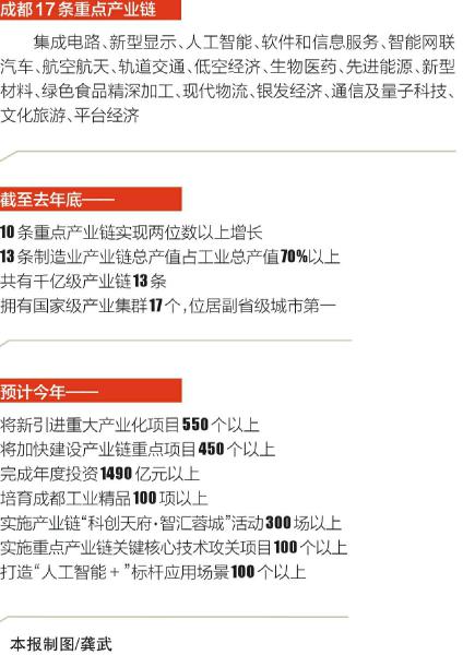 现实也给出有力答案。会上,一组数据引发热议:去年,成都17条重点产业链中,有10条实现两位数以上增长。目前,成都市千亿级产业链增至13条,国家级产业集群总数增至17个,居副省级城市第一位。这也成为去年成都经济增速跑赢全国、全省的动力源。