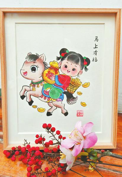 一匹身形矫健的骏马昂首奔腾,背上坐着憨态可掬的福娃,身前抱着福袋,身旁散落着金元宝——这幅名为《马上有福》的绵竹年画新作,由绵竹木版年画德阳市级代表性传承人贾君创作完成。作品以浓郁的“中国红”为主调,用萌趣的造型和明快的色彩,为丙午马年献上“即刻纳福、财运亨通”的美好祝福。