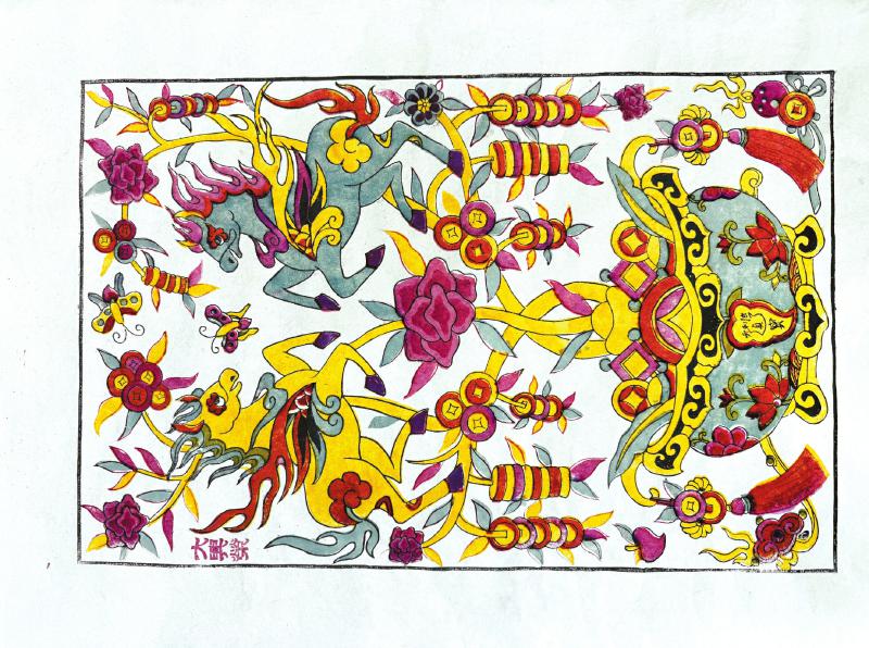 在《马上有福》的创作中,贾君采用了Q版的萌化处理,弱化传统年画的严肃感,让小马既有奔腾的活跃姿态,又不失乖巧可爱;福娃则保留稚拙特征,与骏马形成呼应。
