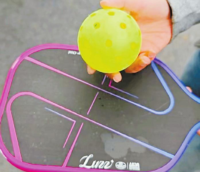 站在场边看,匹克球运动像个“混血儿”:场地大小类似羽毛球场,球网高度像网球场,击球时又像放大版的乒乓球。其装备也很简单:一副球拍,看起来像大号乒乓球拍;用球为带孔轻质塑料球,略大于网球。