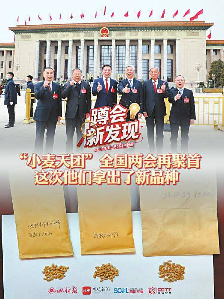 3月4日,人民大会堂前,全国人大代表、河南科技学院教授茹振钢,全国人大代表、河北省石家庄市农林科学研究院名誉院长郭进考,以及全国人大代表、四川省农业科学院学术委员会主任杨武云,互赠小麦新品种。