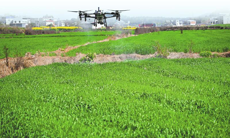 今年的春天来得早,越冬虫卵“蠢蠢欲动”。前几天,农业专家提醒要严防农作物病虫害,李发金决定未雨绸缪,叫来无人机植保队伍提前喷洒农药和施肥。“无人机一天可喷洒400多亩地。”李发金说,过去人工打药,每人每天只能打6至7亩地。