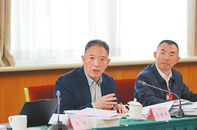 3月9日,十四届全国人大四次会议四川代表团在驻地举行小组会议,李世亮代表(左)就保护民营企业合法权益,促进民营经济发展发言。 川报集团特派记者 欧阳杰 摄