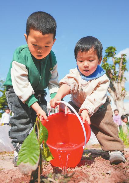 ③3月11日,遂宁市大英县天星幼儿园开展植树添绿活动,孩子们给树苗浇水。刘昌松 摄(C视觉)