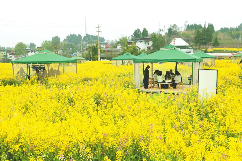 近日,乐至县“帅府粮仓”的油菜花竞相开放,第二届“把春天煮进火锅里”系列活动如约而至。不少市民游客来到这里,在金浪翻涌的花海里,架锅举箸,品味春天。