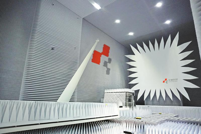 在电波暗室,记者看到,工作人员正在对客户产品进行电磁兼容测试。