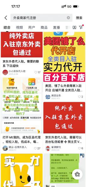 记者在某社交平台上搜索显示的“代开外卖店”服务。