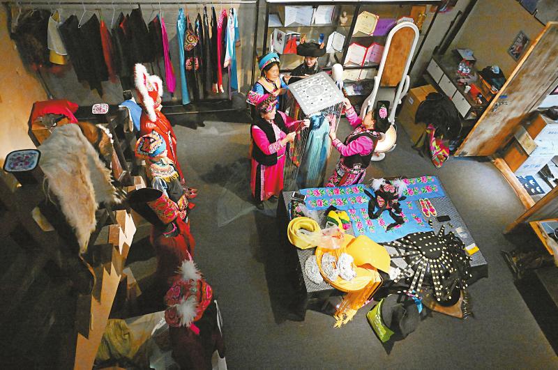 3月12日,陈士江(右二)和绣娘们在阿坝州茂县非遗传习中心一起整理要去走秀的服饰。