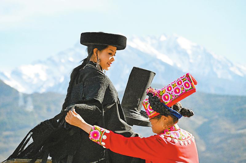 3月11日,在阿坝州茂县的雪山脚下,陈士江的妈妈正在为她整理出席时装周国际时尚产业交流会将要穿的民族服饰。