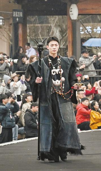 3月20日,来自阿坝州汶川县威州镇双河村的“00后”羌族男孩车元龙在2026纽约时装周·亚太无锡秀上展示羌族服装“尔玛的嫁衣”。