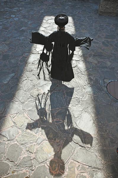 3月11日,在阿坝州茂县非遗传习中心陈士江工作室外,陈士江穿上“尔玛的嫁衣”练习走台步。