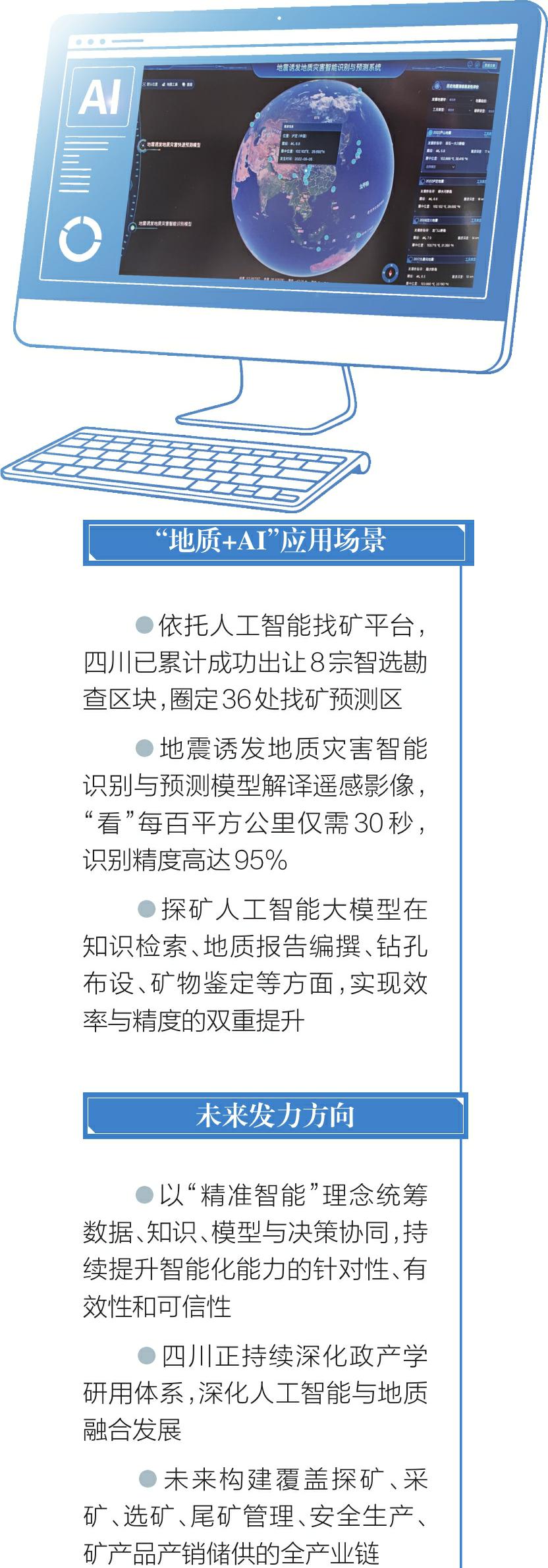 以用户为中心,推动AI更好服务于地质领域,四川正持续深化政产学研用体系,深化人工智能与地质融合发展。四川省自然资源投资集团数科公司相关负责人介绍,随着“AI+探矿大模型”落地,未来将构建覆盖探矿、采矿、选矿、尾矿管理、安全生产、矿产品产销储供的全产业链,推动专业经验与人工智能深度融合,助力地质矿产产业高质量发展。