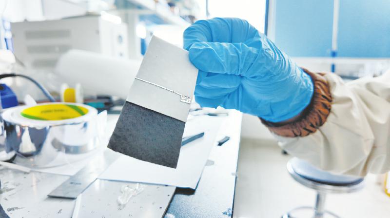 “顶层铝电极是电荷仓库;中间超疏水氟化乙烯丙烯共聚物膜像荷叶一样,接触角高达158°,能让液滴快速滚落减少能量损失;底层壳聚糖修饰的碳毡,就是专门‘钓’铀的‘鱼竿’。”金先淳拆解其中原理说,当卤水液滴撞击薄膜,固液界面瞬间产生高压电能,电子立即将吸附的六价铀还原并经后续的化学反应,最终形成稳定的铀沉淀物。