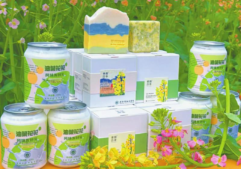 你喝过油菜花酸奶吗?今年,付绍红团队以“长花100”油菜花提取物为原料生产的油菜花酸奶首次少量投产,受到消费者欢迎。据初步统计,本月油菜花酸奶销量已超4000瓶。此外,团队还开发了油菜花精油皂、滴胶工艺品等衍生产品,让油菜花实现可食、可用,游客也能把“春天的味道”带回家。