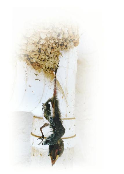 田丽在野外考察时拍下的挂在巢边死去的雏燕。
