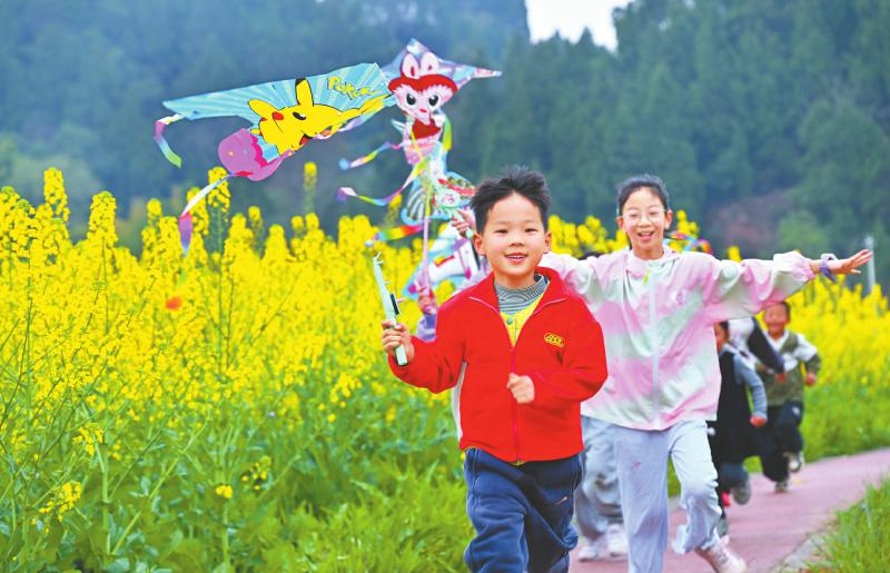 春日,小朋友在眉山市仁寿县青岗乡盘龙村的油菜花海中玩耍。潘建勇 摄(C视觉)