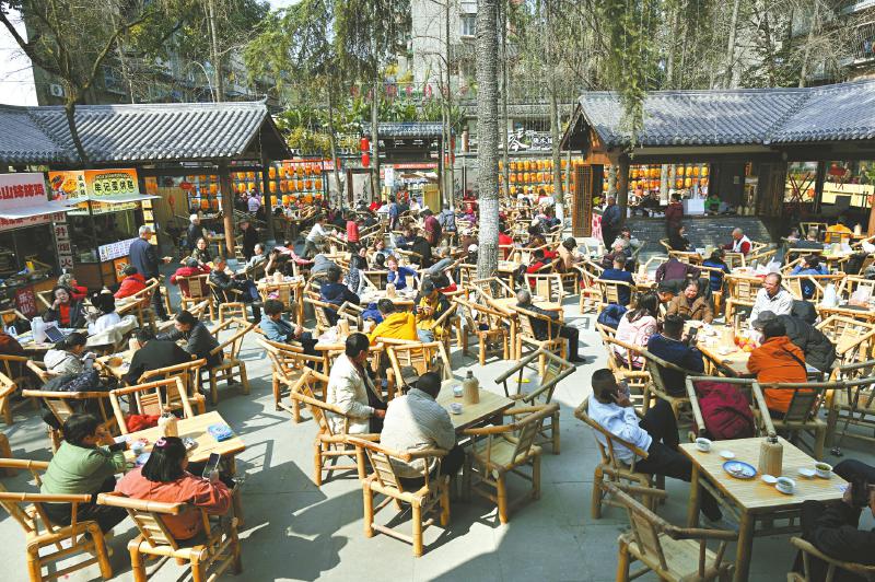 市民游客在成都市金牛区抚琴夜市内的当垆茶肆喝茶休闲。 四川日报全媒体记者 肖雨杨 摄