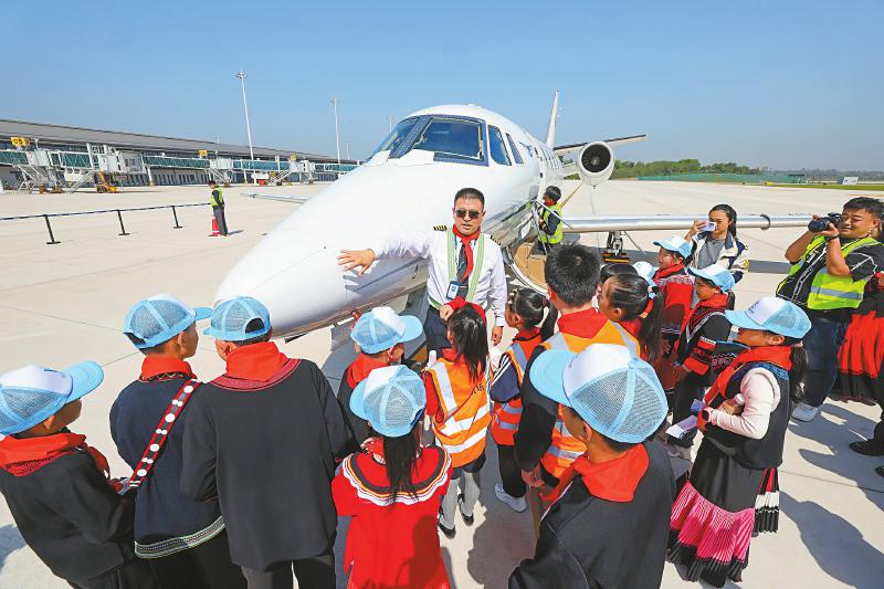 4月4日,在“蒲公英计划”航空科普——马边少数民族儿童乐山机场研学活动中,来自马边4所小学的24名少数民族小朋友,在老师与工作人员陪同下,走进即将通航的乐山机场,开启一场别开生面的航空探索之旅。图为小朋友们在校飞机组机长带领下参观校飞飞机。 章綦 摄(C视觉)
