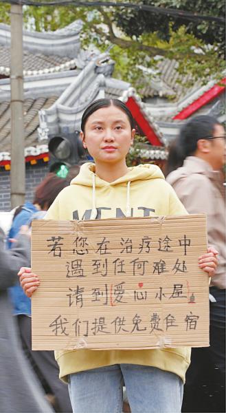 四川大学华西医院门口,川流不息的人潮中,有一个身影格外显眼:她举着一块牌子,步履平缓地穿梭在人潮中。牌子上的字简单又直白——“若您在治疗途中遇到任何难处,请到爱心小屋……”