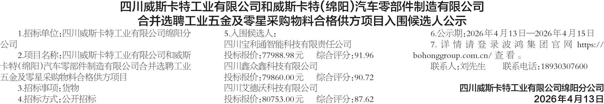 ·四川威斯卡特工业有限公司和威斯卡特(绵阳)汽车零部件制造有限公司合并选聘工业五金及零星采购物料合格供方项目入围候选人公示