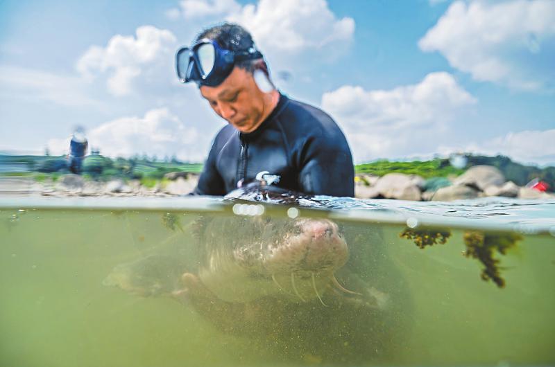 4月12日,科研人员放流安装有超声波标记的长江鲟。