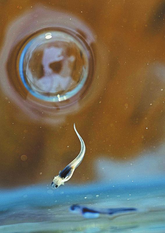 4月14日,出生约一周的长江鲟鱼苗拖着细小的尾巴在水中游动。