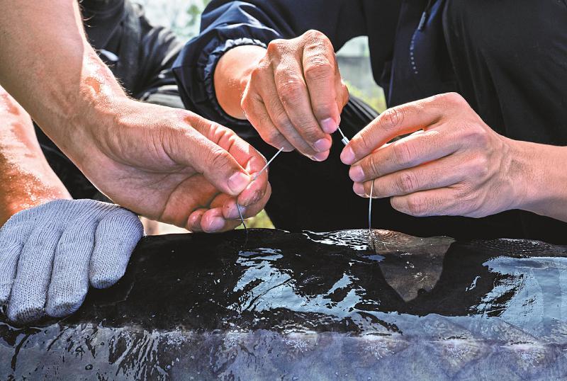 3月24日,科研人员为放流的长江鲟亲鱼安装超声波标记。