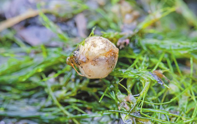 4月7日,科研人员在产卵场捞起的江底漂流物中发现一颗长江鲟鱼卵。据观测,长江鲟的受精卵最大直径可达3.5毫米。