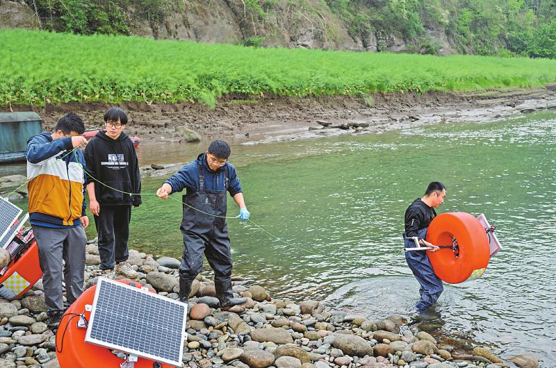 3月23日,科研人员在产卵场中布设超声波标记遥测系统。