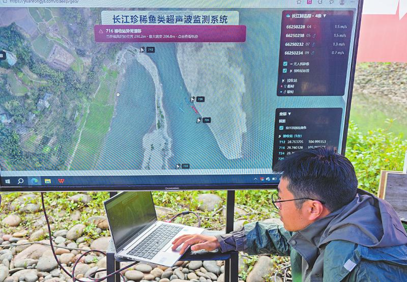 4月14日,科研人员通过超声波标记遥测系统对放流的长江鲟进行监测。