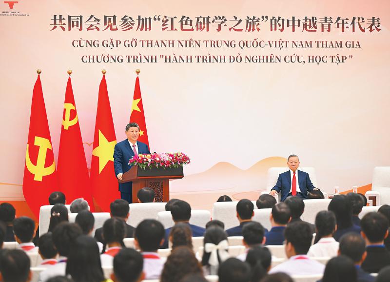 四月十五日上午,中共中央总书记、国家主席习近平在北京人民大会堂同来华进行国事访问的越共中央总书记、国家主席苏林共同会见参加“红色研学之旅”的中越青年代表。新华社记者李响摄
