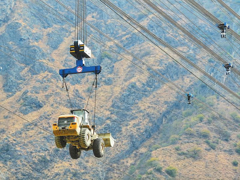 装载机“坐”高空飞索过河