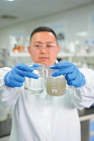 在超磁分离技术实验室,唐珍建为记者现场做了一次实验。只见他先将500毫升污水倒入烧杯,再将适量混凝剂、磁粉依次倒入。随着他用搅拌棒匀速搅拌,污水中的杂质逐渐凝聚成絮团状。