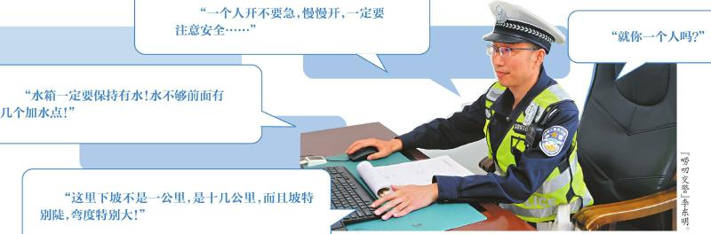 雨天行车要慢要点刹,长下坡要确保刹车温度降下来,货车要加好水,雪天行车一定要慢……李东明将这些“唠叨”熟记于心,虽然降温点附近已设置了行路警示牌,但交警当面的提醒,更能让跑长途的大货车司机保持清醒,提升行车安全性。